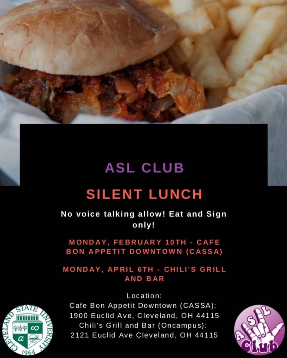 Cleveland State Univeesity’s ASL Club will be hosting two “Silent Lunches” this semester. One will be held February 10. The other to be held on April 6. Details in the graphic above.